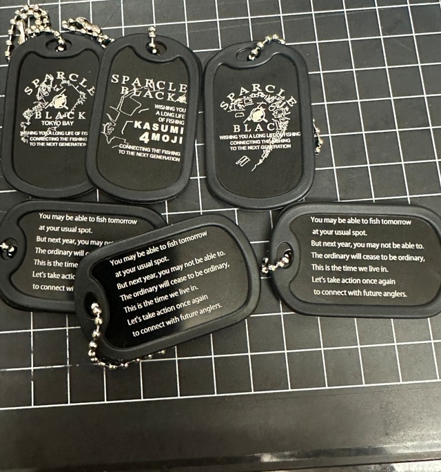 SPARCLE BLACKアルミアルマイトドッグタグキーホルダー 三└(┐卍^o^)卍ドゥルル 表にSPARCLE BLACK 東京湾、四日市港、大阪湾のシルエット。 裏面にはメッセージを彫刻しています。 You may be able to fish tomorrow at your usual spot. But next year, you may not be able to. The ordinary will cease to be ordinary, This is the time we live in. Let's take action once again to connect with future anglers. 貴方はいつもの場所で明日は釣りをすることができるかもしれない。 しかし、来年にはできなくなるかもしれない。 当たり前が当たり前で無くなる、 今はそういう時代である。 今一度、未来の釣り人に繋げる行動しよう。 裏面にはメッセージの代わりに ネームなど好きな文字を入れる事ができます。(最大4行) 文字入れを書いてもらうフォーマットを製作中(ネットショップ上) 販売まで今しばらくお待ちください。 それまで待てないよ〜ってかたはお問い合わせより、ご連絡、もしくは[email protected]にメールください。 お名前やSNS上でのアカウント名など分かりましたらスムーズにいけます!