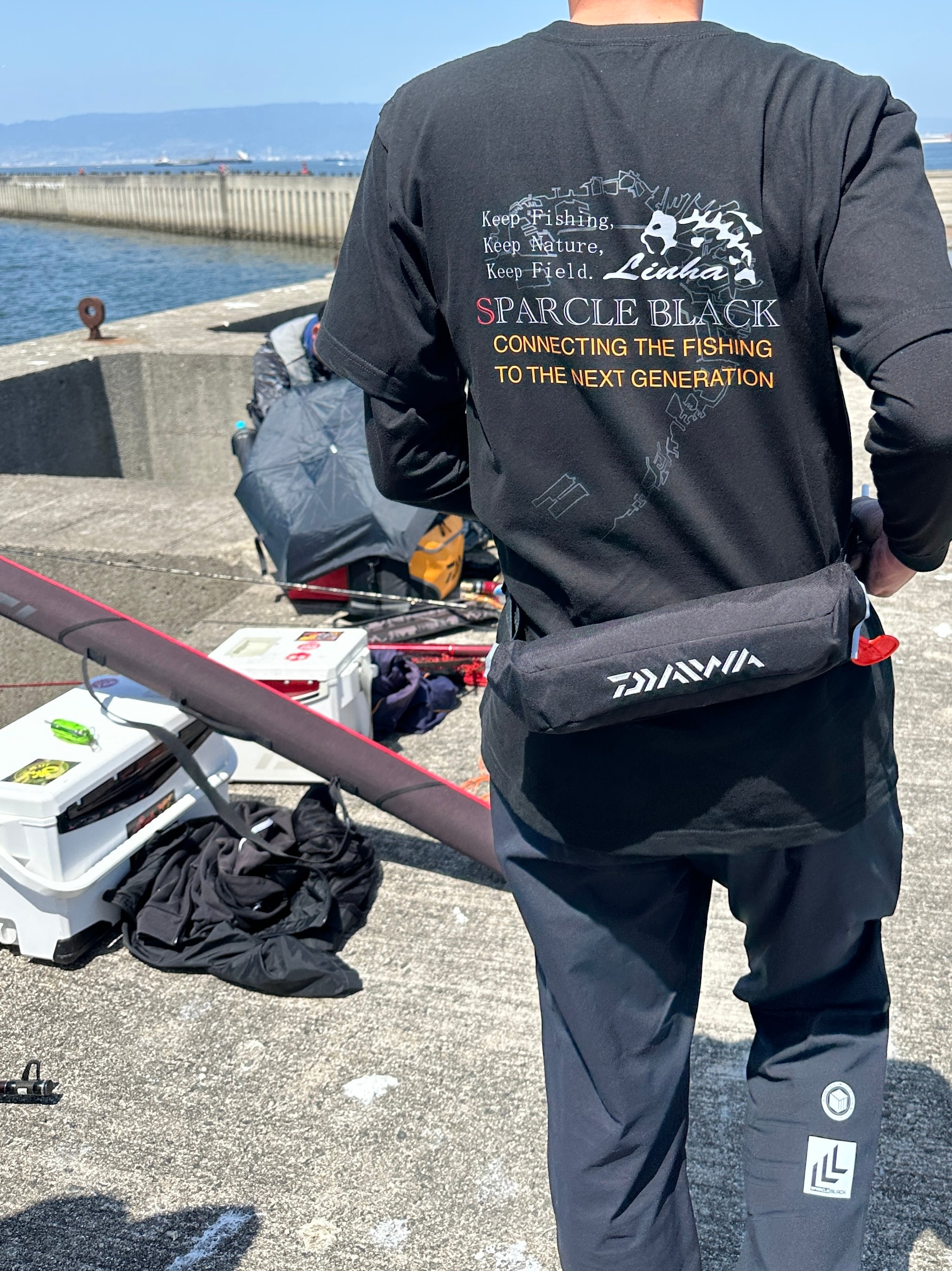 バックには大阪湾モチーフデザインを背景にLINHA、SPARCLEBLACKのメッセージロゴを